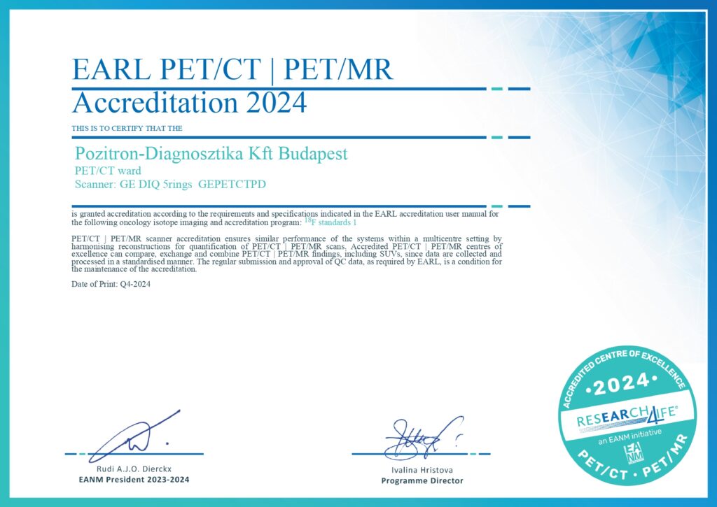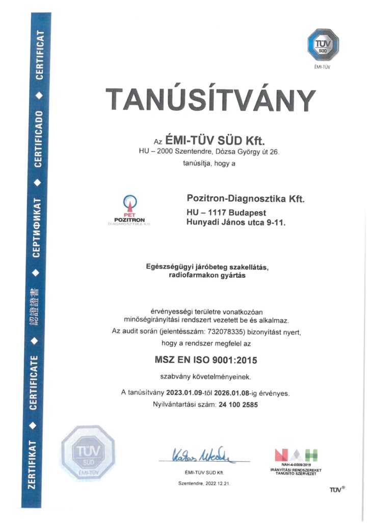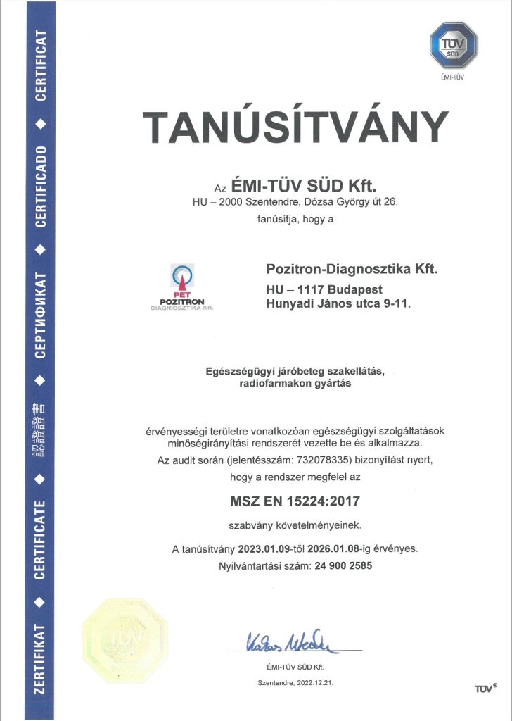 A Pozitron-Diagnosztika Központ vezetősége és munkatársai minőségpolitika irányába elkötelezett célkitűzése a páciensek, ügyfelek tartós elégedettségének kivívása és megtartása. Ennek érdekében alakítottuk ki, működtetjük és folyamatosan fejlesztjük az ISO 9001 minőségirányítási és az gyógyszergyártás területén alapvető GMP előírásokat, a gyógyszergyártási minőségi követelményeket, biztosítva annak személyi, tárgyi, kommunikációs és módszertani feltételeit. Mindemellett kiemelten fontosnak tartjuk olyan akkreditációs rendszerekben való részvételünket, melyek a vizsgálataink magas szakmai színvonalát garantálják.
